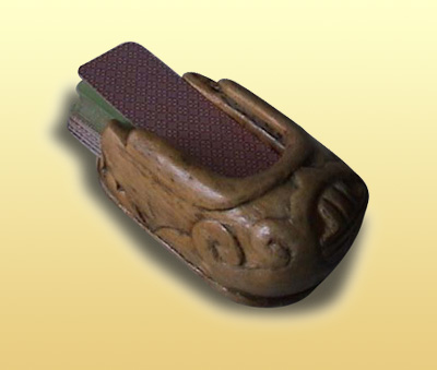这张照片展示的是我国迄今为止,最为古老的原始木履。板上有五个洞,作为系绳之用。1989年在浙江省慈湖新石器时代良渚文化时期遗址发现。出土时一只已腐烂,另一只比较完整。据考古学家运用C14测定为5365士125年前的遗物。这虽是仿制品,但再现了原始木履的形制。(来源:中国鞋文化博物馆)