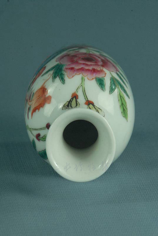 侈口、长颈、斜肩、直腹、凹平底。瓶身绘粉彩丹凤朝阳图。胎薄,里外施白釉。