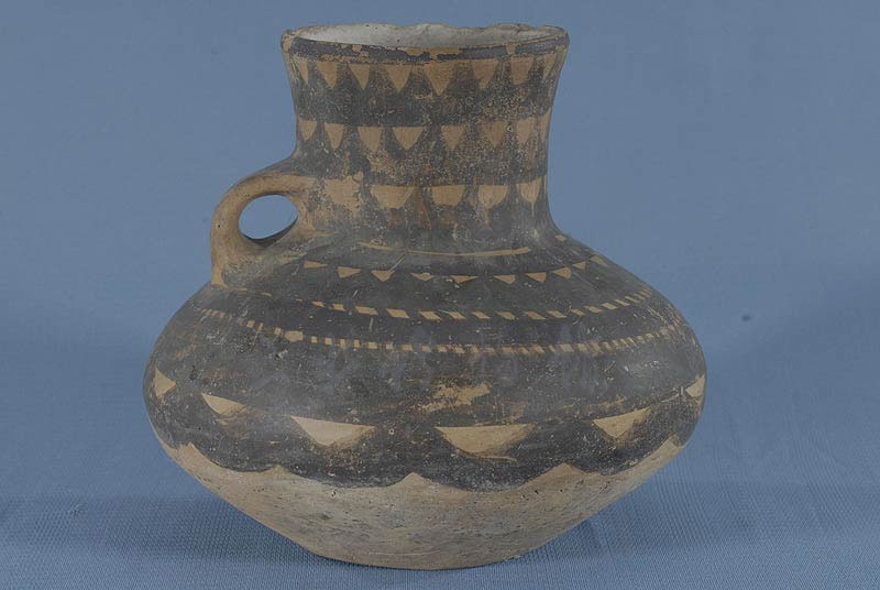 侈口、直颈、扁圆腹,颈肩间附环形耳一,平底。外壁施黑彩,颈部及肩锯齿纹,腹上部二粗带纹,中部一波纹,下部不着彩。胎薄。