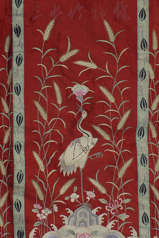 纱质,上衣呈黑色,裙子呈红色,上衣较窄小,裙子过膝,裙口较窄。上衣为立领,刺绣有花、仙鹤灯纹饰,有三粒布制纽扣,裙子刺绣花草、仙鹤等纹饰,右侧有纽扣,束腰与下摆处有折纹。此套服装能显现出晚清女人的清秀和娴静。