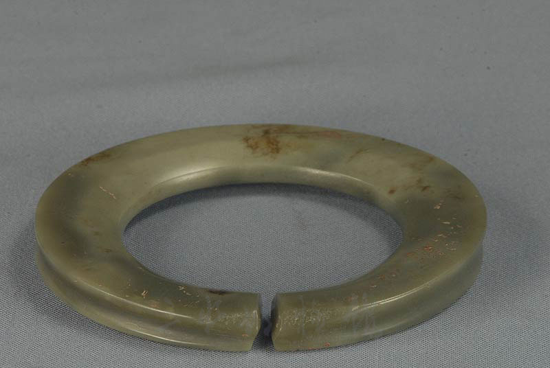 玉玦扁平,呈青色,玉质温润,体呈环形,有一缺口,玉玦外沿呈凹弦纹,造型特别,是典型的新石器时代制品。